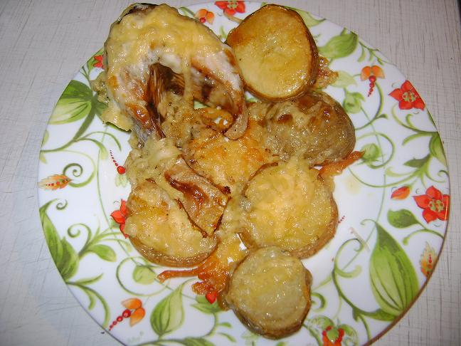 Горбушу порезать на кусочки толщиной примерно 3-4 см. Картошку (с кожурой ) кружочками. Выложить все на противень, смазать майонезом и посыпать специями. Запекать в духовке минут 40. В конце присыпать сыром, и дать ему расплавиться.