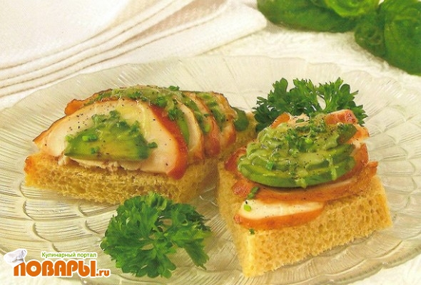 Авокадо и филе цыпленка нарежьте тонкими ломтиками, лук порубите. На ломтики хлеба уложите филе цыпленка, затем - авокадо. Посыпьте луком, сыром, поперчите. Запекайте бутерброды 1-2 минуты при 240 °С.