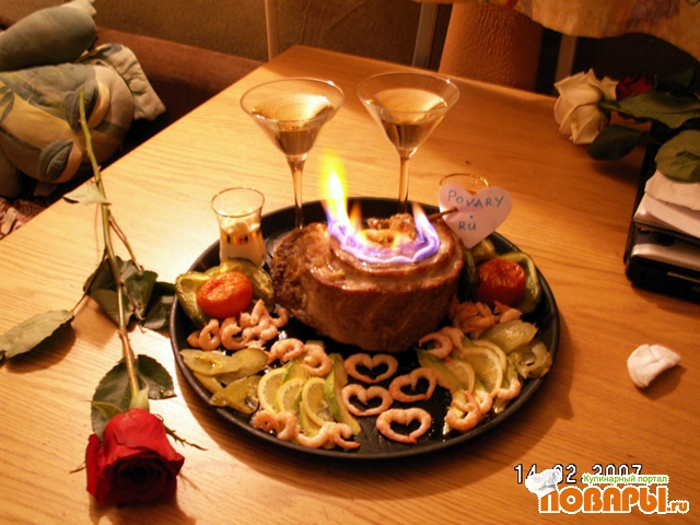 Готовое мясо выкладываем на поднос, внутрь кольца кладем грибы в сметане, выкладываем печеные с помидорами перцы, расставляем соусы, раскладываем креветки и порезанные овощи. В желобок на мясе наливаем спирт, поджигаем... подаем к телевизору )))