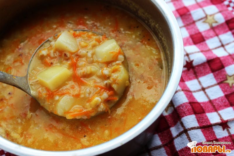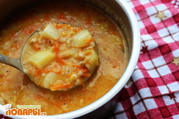 Заливаем морковь водой, солим воду, добавляем столовую ложку (или 2) гречки. Доводим до кипения и опускаем в бульон картофель, тыкву, перец (нарезаем произвольно, можно кубиками). Когда картофель будет практически готов, то добавляем в суп гороховое пюре, перловку. Варим еще несколько минут. Суп должен быть густым.