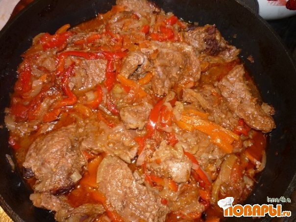 Говядину режем на кусочки, отбиваем и в скороду, добавляем сладкий перец, лук, морковь, нарезанную соломкой, кетчуп (хайнц) - 3-4 ст.л., солим, перчим и тушим до готовности. Приятного аппетита!!!