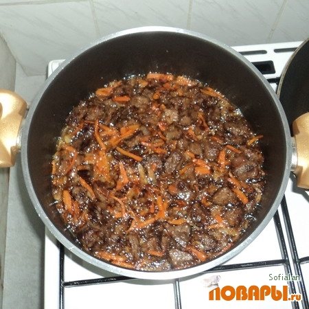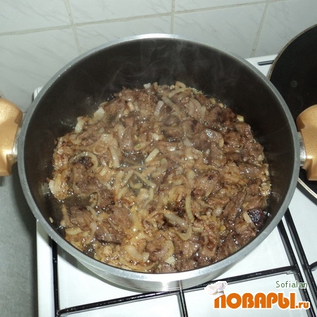 Добавляем к мясу лук, обжариваем, помешивая, примерно 10 минут, пока лук не станет золотистым.