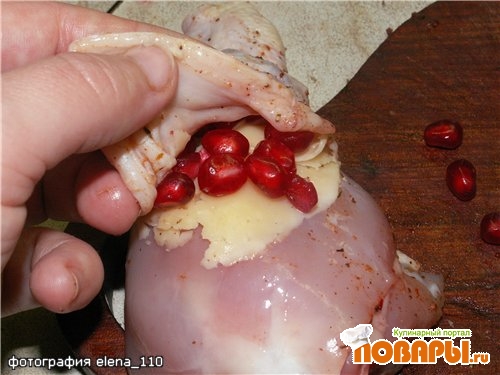 Горсть гранатовых зeрен аккуратно положить под кожу на сыр, при этом нужно придерживать кожу рукой.
