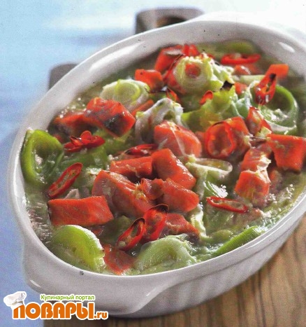 Гратен из форели и лука-порея с кокосовым молоком