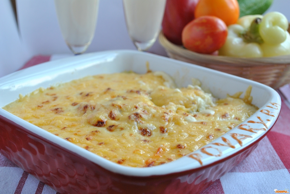 Приготовить соус « бешамель». Растопить остальное сливочное масло, высыпать муку, размешивая очень быстро. Маленькими порциями влить сливки, постоянно растирая мучную смесь, не давая образовываться комочкам. Добавить сыр ( где-то грамм 50) и дать ему расплавиться. Добавить соль и белый перец. Залить этой смесью курицу и сыр. Посыпать сверху оставшимся сыром и поставить в духовку ( 210 градусов) минут на 10.