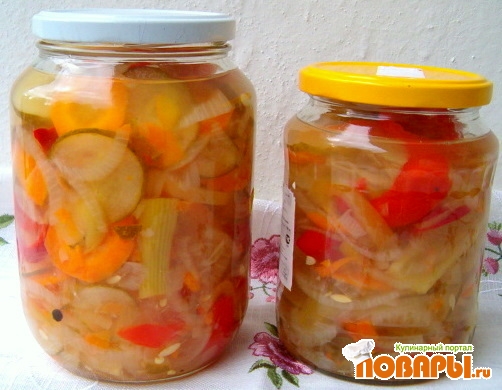Опустить овощи в кипящий маринад, довести до кипения. Варить пару минут.