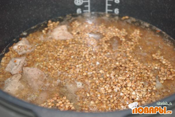 В мультиварку высыпаем промытую гречку, добавляем мясо, грибы, лук, посыпаем все специями, солим, перчим. Добавляем воду, ставим на режим каша.