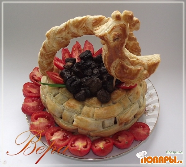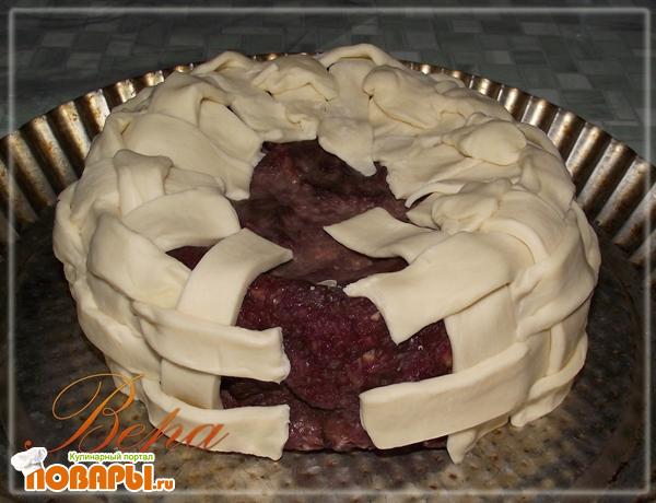 Тесто нарезать полосками шириной 1,5 см. сплести на основании из фарша лукошко.