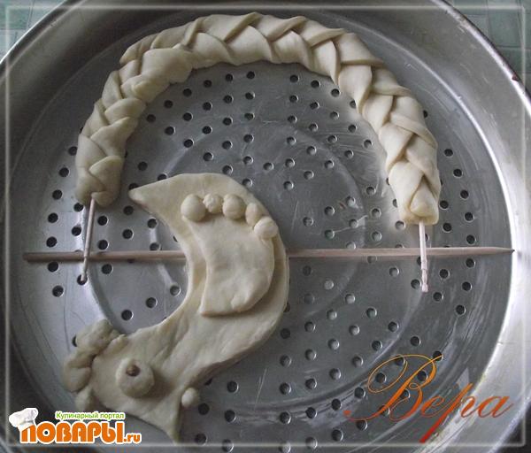 Из остатков теста сплести ручку для лукошка и слепить петушка.