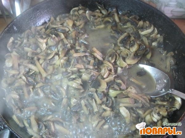 Всыпать грибы и лук, посолить, поперчить, накрыть крышкой и тушить в течение 15 минут на среднем огне, периодически помешивая.