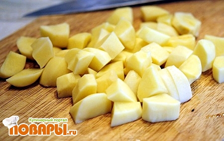 Как только говяжий бульон будет готов нужно выложить мясо в сторону и можно приступать к основному приготовлению супа. Начнем с картофеля. Картофель требуется почистить. Помыть и порезать на кубики, не очень маленькие. Порезанный картофель выкладываем варится минут 15-30, зависит от сорта, так чтобы картофель сварился на 60%