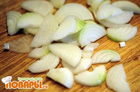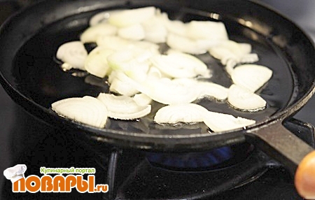Лук почистить, помыть и порезать полукольцами. Затем обжарить на горячей сковороде с добавлением подсолнечного масла до полу готовности.
