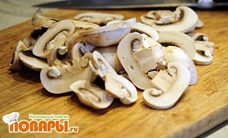 Грибы нужно порезать по форме. Я думаю, что не стоит их резать слишком тонко, чтобы при вкушение было больше вкуса.