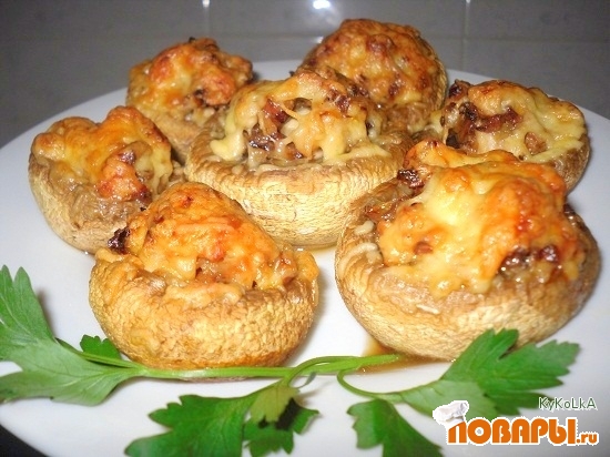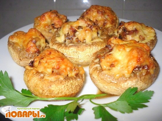 На мелкую терку натираем сыр. Выкладываем на противень шляпки грибов и заполняем их с горкой уже подготовленной начинкой, сверху посыпаем натертым сыром и отправляем в разогретую духовку до 180С на 10 минут.