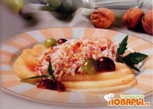 Выложите крем на груши. Оформите салат виноградом и орехами.