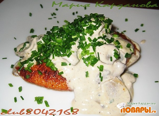 посолить соус. на кусочки обжареной индейки полить соус и посыпать измельченный шнитт лук