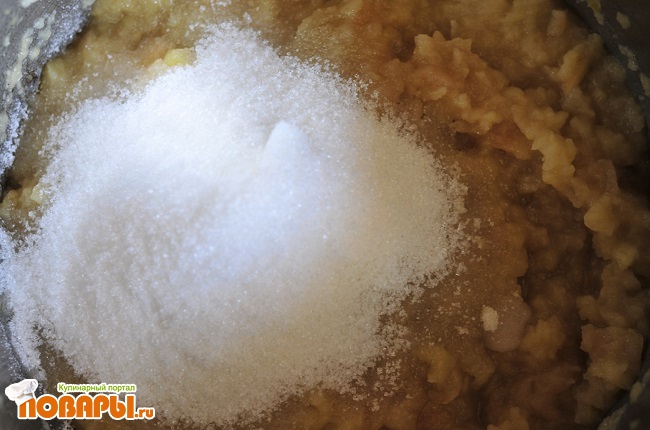 Добавьте 1 стакан сахара и так же продолжайте помешивать. Яблоки должны превращаться в пюре. Подавите их, к примеру вилочкой. Варите еще минут 10 на небольшом огне.