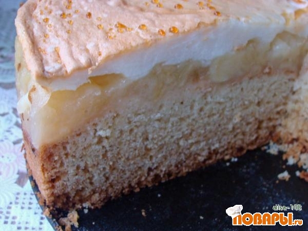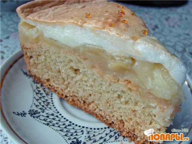 Нагреваем духовку до 180 градусов. Хорошенько смешиваем все ингредиенты для теста. Выстилаем дно и стенки формы. Выпекаем тесто примерно 20 минут, пока тесто слегка не подрумянится. Тем временем готовим начинку. Тушим яблоки на среднем огне в воде с сахаром, примерно 5 минут.