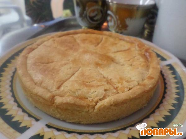 Раскатать вторую часть теста и накрыть пирог, обрезать остатки теста из них скатать жгутики и оформить края пирога. Острым ножом сверху сделать надрезы или украсить по вкусу. Выпекать около часа, все зависит от духовки, за минут 10 до готовности смазать белком и допекать до румяного цвета.Пирог получается очень нежным. Вынимать из формы теплым, не горячим, чтобы не развалился.