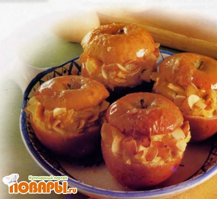 Включите духовой шкаф, выставив температуру 180°С для газовой духовки и 200°С - для электрической. Наполните яблоки творожной массой, посыпьте миндальной стружкой и накройте верхушками.