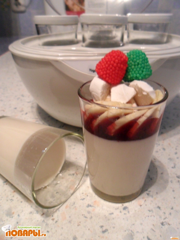 Всё смешиваем миксером,разливаем по стаканчикам.Ставим в йогуртницу. Через 7 часов йогуртница сама сообщит: "Хозяйка, всё готово!"