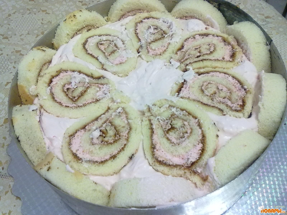Теперь делим смесь на 2 части ,1 часть выливаем в подготовленную форму с рулетом по бокам, сверху выкладываем оставшийся порезанный рулет и заливаем 2 частью суфле, а наверх кладем круг бисквита.Все украшаем по своему усмотрению,можно под мастику , а можно просто сливками, сверху уложить клубничку!