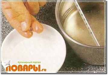 Растворить сахар в воде и нагреть сироп до температуры 117 °С. Готовность сиропа можно определить так: в пальцах немного остывшую каплю сиропа можно будет скатать в мягкий шарик.