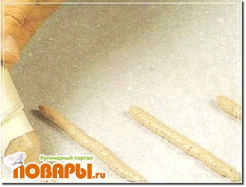 Из кондитерского мешка с маленькой ровной насадкой выпустить на лист пергаментной бумаги тонкие «колбаски». Выпекать 25-30 мин при 110-120 °С.