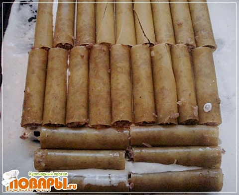 Далее приготовленный (хорошо перемешанный фарш) забиваем в трубочки. Плотно забивать не надо, иначе трубочки лопаются.