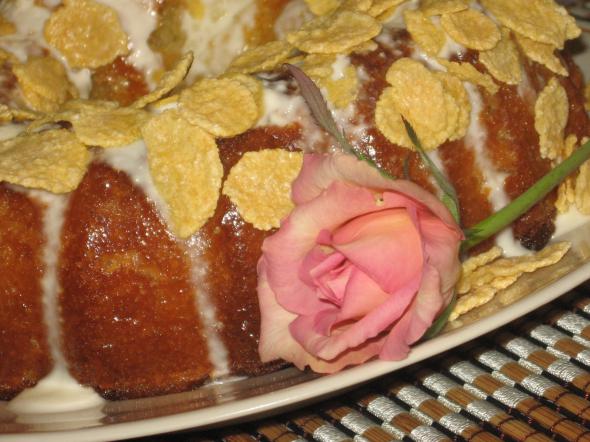 Готовим сметанную помадку: 2 столовых ложки сметаны + 2 столовых ложки сахара, доводим до кипения, помешивая, поливаем наш кекс и посыпаем кукурузными хлопьями.
