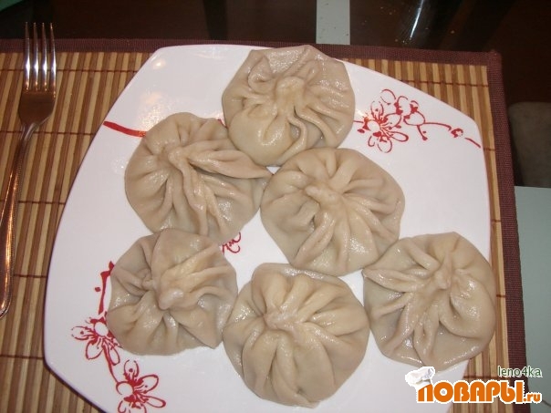 Из муки и яйца замесите на теплой воде крутое тесто, подсолите. Раскатайте тонкими пластами и нарежьте кругами (примерно 10-12 см в диаметре). На каждый кусочек теста выложите начинку, а затем соберите тесто в складки, соединив их в виде "узелка" в центре поверхности, покрывающей начинку.