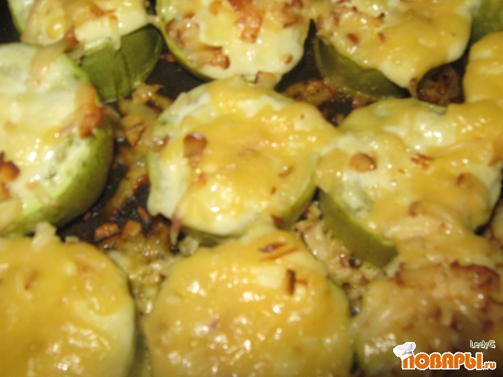 На крупной терке трем сыр, можно потереть колбасный сыр, тогда у готового блюда будет пикантный копченый вкус. Посыпать кабачки тертым сыром и запекать в духовке до золотистого цвета.