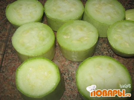 Кабачки моем, молодые не чистим, режем на кружки толщиной 3 см