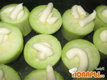 Смазываем ставшие чуть мягкими кружки кабачков майонезом и опять отправляем в духовку на 15 - 20 минут.