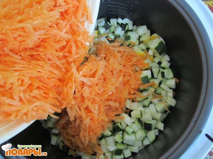 Морковку натираем на средней терке, лук мелко нарезаем, а кабачки тоже нарезаем, но небольшими квадратиками.