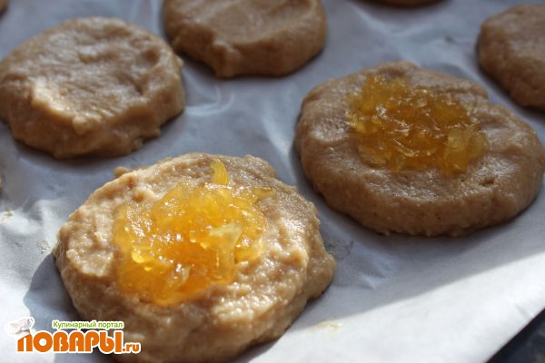 Формируем круглое печенье. Я на некоторых печеньях делала "пуговицы" из неперемолотого кабачкового варенья (свекровь терла кабачки на терке).