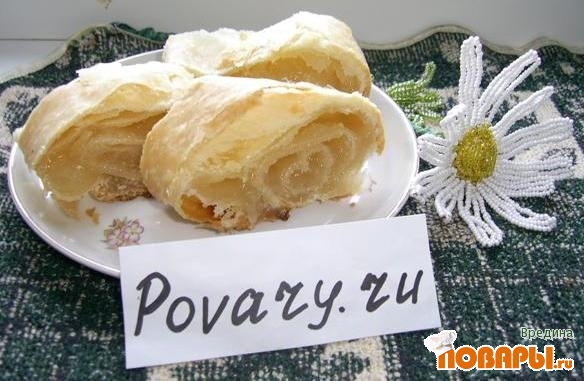 Готовое тесто разделить на 2 равные части. Каждую часть раскатать, придав ей форму круглого или квадратного пласта. Положить на пласт ровным слоем подготовленную начинку, свернуть рулетом, сверху немного приплюснуть и выпечь на противне в духовке.