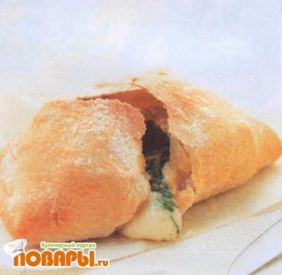 Переложите на горячий камень для пиццы или противень, посыпьте небольшим количеством муки и выпекайте 20-25 мин, пока кальцоне не станут хрустящими и румяными. На стол подавайте горячими.