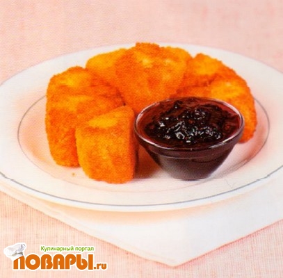 Обжаривать запанированный сыр до образования ровной хрустящей корочки. Подавать горячим с клюквенным вареньем или джемом.