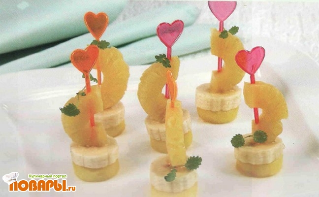 Скрепите фруктовые канапе шпажками и полейте медом.