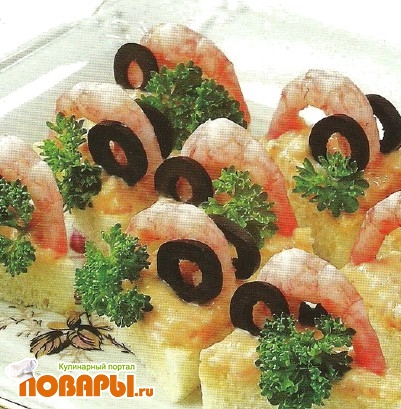 Готовые канапе оформите креветками, маслинами и зеленью.