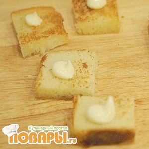Сыр порезать дольками, в таком же количестве сколько грибочков и тостов.
