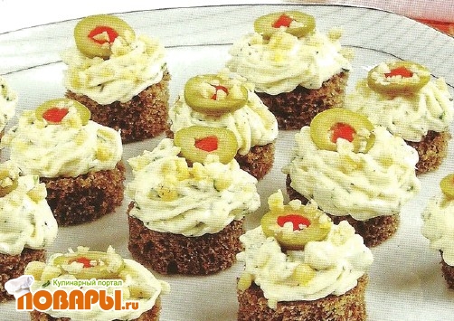 Оформите кавдое канапе оливкой и посыпьте орехами.