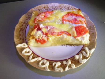 Залить сверху белым соусом. В идеале сверху выкладываются кусочки моцареллы. но у нас ее днем с огнем не найдешь. Поэтому я выложила верх тонко нарезанными кружочками помидора и в духовку на 25 мин. Затем достаем. посыпаем тертым сыром (в нашем случае гауда) и опять в духовку на пять минут.