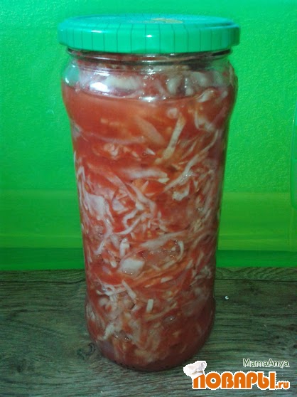 Банки простерилизовать, на дно каждой положить лавровый лист и перец, сверху выложить капусту в томатном соке. Банки закрыть крышками и спрятать до зимы.