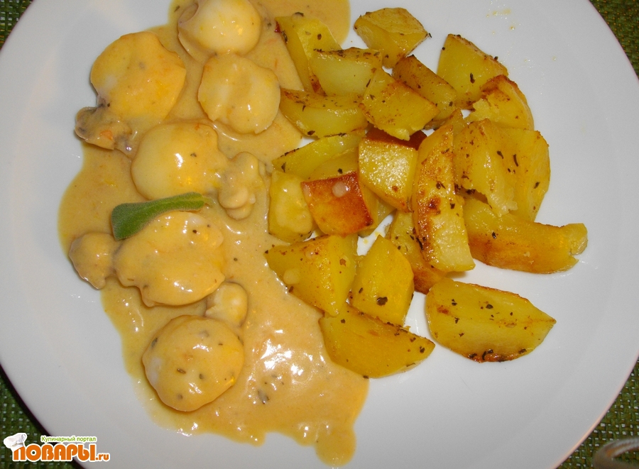 В сотейник выложить промытые каракатицы, влить сок, сливки, посыпать специями, посолить немного и потушить 8-10 минут, не больше. Подать, гарнировав картофелем.