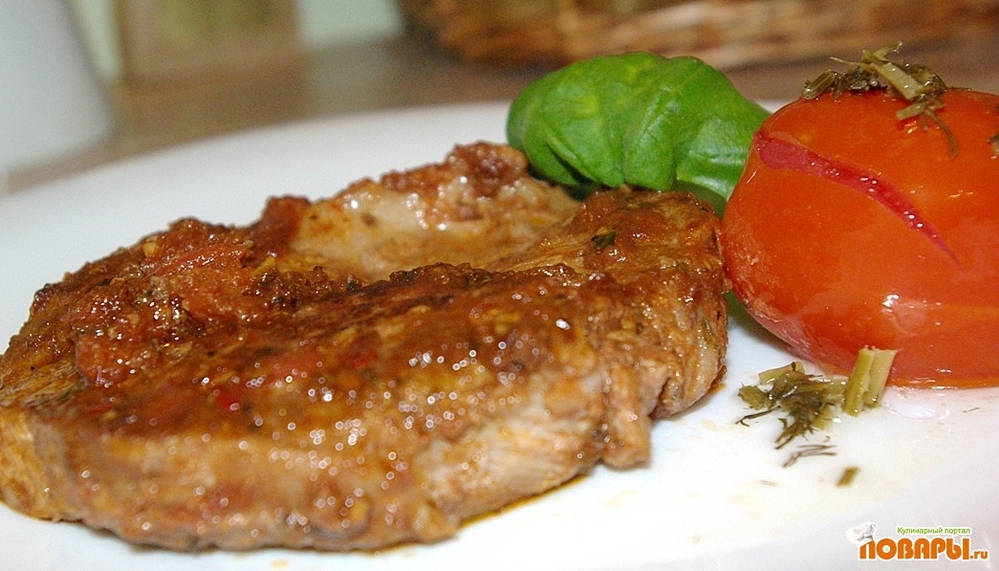 Мясо обжарить с одной стороны, перевернуть, выложить на кусочки помидоры, оставшиеся от маринада.