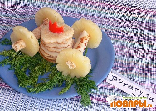 На тарелку я уложил зелень. Собрал стопку оладьев – это карета.
