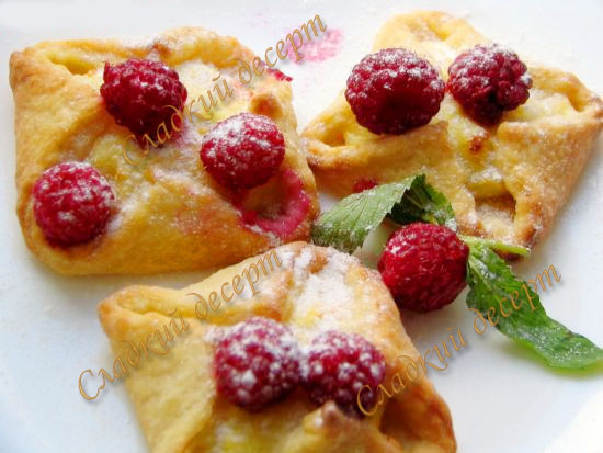 На месте сбига зафексировать получше (чтоб не открылись при выпечки). Выпекать при 180 гр. Примерно минут 15-20. Готовые посыпать сахарной пудрой и украсить малинкой. Тесто очень мягкое и вкусное