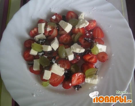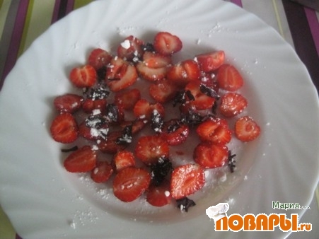 Клубнику выложить на блюдо, сверху посыпать сахарной пудрой, добавить несколько капель бальзамика и нарезанный базилик, дать немного постоять (пропитаться)